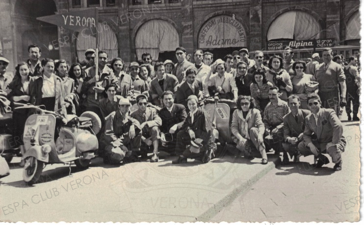 Foto di gruppo del Vespa Club Verona a Bologna, raggianti per la bella e intensa giornata. In primo piano sulla…