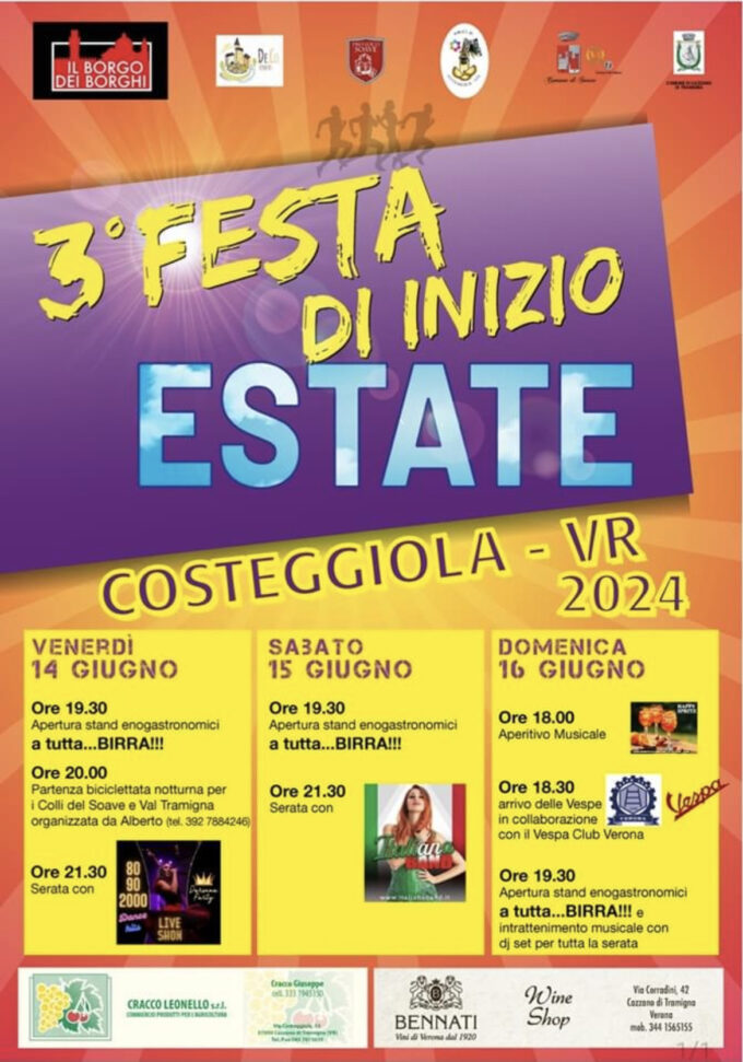 Vespisti, proponiamo il Vespaperitivo di domenica 16/06 alla Festa d’inizio Estate a Costeggiola di Soave, con una passeggiata vespistica tra la Val di Mezzane e Val Tramigna.